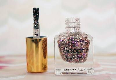 Un joli vernis rempli de paillettes dorées, roses claires et foncées.